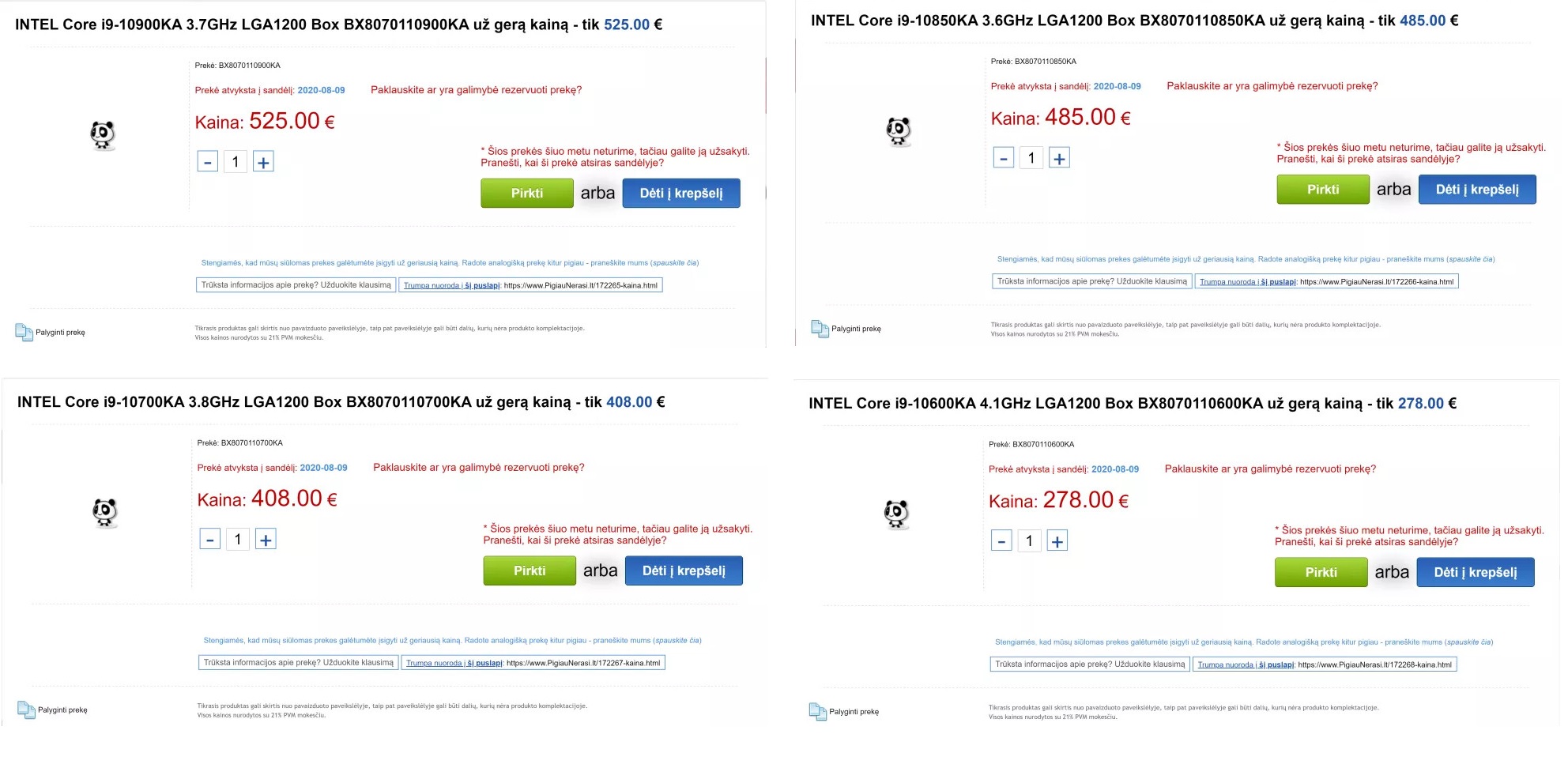 Mục so sánh giá trong trang web cho thấy những sản phẩm này được định giá ngang với các chip i9 F và i7 F, chênh lệch vào khoảng 2%. Nhà bán lẻ tại Litva cho biết các mẫu sample nội bộ của các CPU này sẽ có sẵn vào ngày 9 tháng 8.