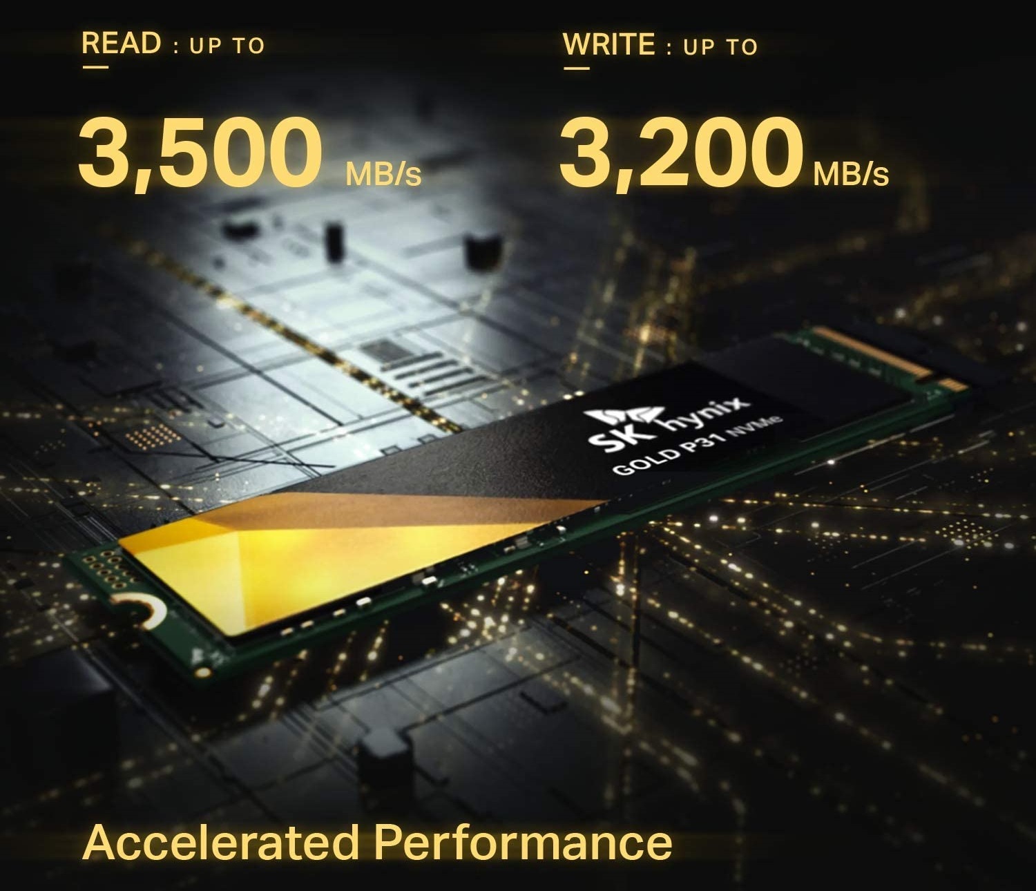Ổ SSD Gold P31 có định dạng M.2 NVMe, hoạt động theo giao thức PCIe 3.0 và bao gồm hai tùy chọn dung lượng 500 GB hoặc 1 TB. Cả hai đều có tốc độ đọc/ghi tối đa lần lượt là 3500 MB/s và 3200 MB/s, tương xứng với các ổ NVMe PCIe 3.0 tốt nhất, bảo hòa băng thông PCI-Express. SK Hynix nói rằng chất lượng các ổ SSD này phải tương đương với Samsung 970 Evo, nhưng hơn về giá trị.