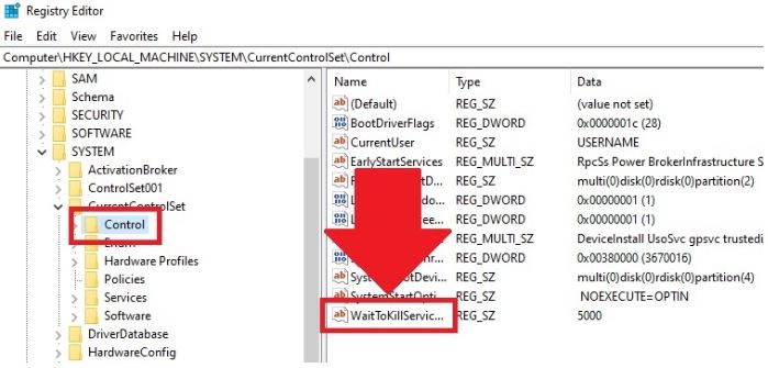 Bước 3: Nhấn đúp vào mục Control, sau đó tìm và mở mục có tên là WaitToKillServiceTimeout ở phía bên phải.
