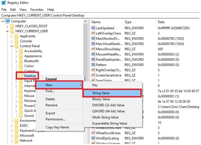 Bước 6: Sau đó bạn nhấp chuột phải vào mục Desktop và chọn New rồi chọn String Value.