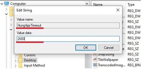 Bước 8: Bạn nhấp chuột phải vào Desktop, chọn New, chọn String Value một lần nữa rồi đặt tên cho mục mới tạo là HungAppTimeout. Sau đó mở lên và nhập 2000 vào ổ Value data rồi chọn OK.