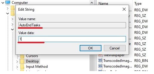 Bước 9: Bạn nhấp chuột phải một lần nữa vào Desktop, chọn New, chọn String Value. Sau đó đặt tên cho mục mới tạo là AutoEndTasks rồi mở lên và nhập số 1 vào ô Value data rồi chọn OK.