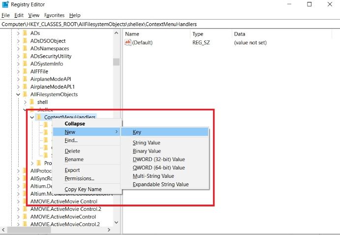 ✓ Sau đó, bạn click chuột phải vào thư mục “ContextMenuHandlers”, chọn New → Key.