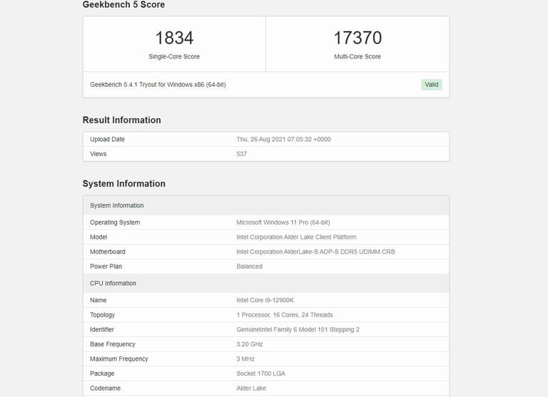 - Một kết quả mới, nhờ sự hỗ trợ của Trình duyệt Geekbench, có lợi hơn cho hàng đầu sắp tới của Intel. Nó cho thấy Core i9-12900K hoạt động tốt hơn Ryzen 9 5950X khoảng 8,1% trong bài kiểm tra đơn lõi và 3,8% trong bài kiểm tra đa lõi. Như với kết quả Core i7-12700, điểm chuẩn này sử dụng chip mẫu kỹ thuật. Kết quả cuối cùng có thể sẽ cao hơn.