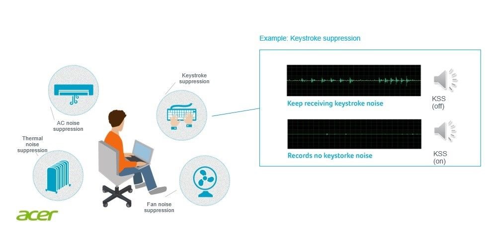- Chức năng theo dõi giọng nói: Công nghệ này trên Acer sẽ theo dõi tần số âm thanh của riêng bạn, sau đó tự động nhận biết và loại bỏ những tạp âm, tiếng ồn xung quanh (như giọng nói người khác, tiếng kéo cửa, tiếng máy lạnh, tiếng quạt máy,...) khi bạn đang đàm thoại ở nơi đông người để mang lại chất lượng âm tốt nhất.
