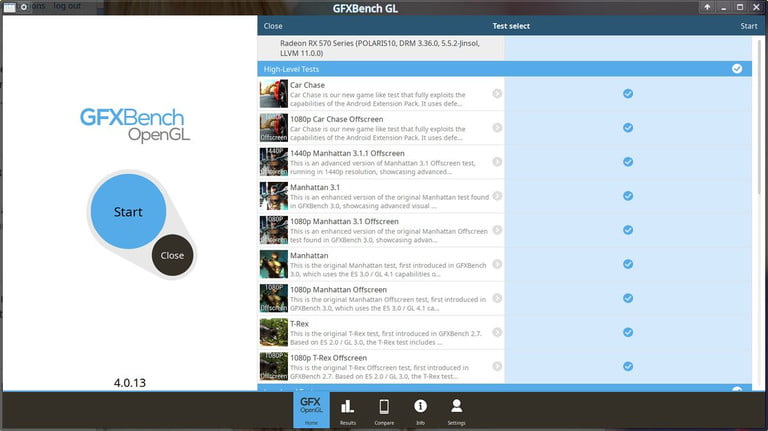 - Tương tự như vậy, bản thân ứng dụng GFXBench 5.0 không có nhiều đường cong học tập, giúp bạn dễ dàng chạy một bài kiểm tra đơn giản về hiệu suất, độ ổn định, chất lượng hiển thị và mức tiêu thụ điện năng. Đây là một tùy chọn đặc biệt tiện dụng cho các bài kiểm tra trò chơi trên thiết bị di động, mặc dù các phiên bản dành cho máy tính để bàn của phần mềm vẫn có thể cung cấp nhiều thông tin hữu ích.