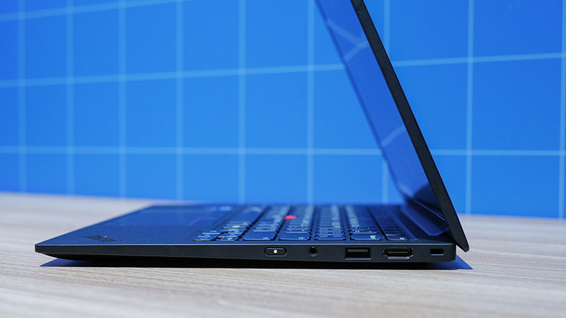 Các cổng kết nối cũng rất đầy đủ: 2 USB-A, 2 Thunderbolt 4, HDMI, jack 3.5mm. Máy vẫn giữ khả năng gập 180 độ, vốn là đặc trưng lâu năm của dòng X1 Carbon.