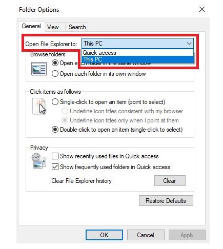 Bước 3: Một cửa sổ mới hiện lên, tại dòng Open File Explorer to, bạn có thể chọn This PC hoặc Quick Access để hiển thị mỗi khi mở File Explorer.