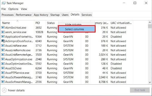 Bước 3: Tiếp theo, bạn nhấp chuột phải vào đầu bất kỳ cột nào và chọn Select Columns. Ví dụ như trong hình là cột Status chẳng hạn.