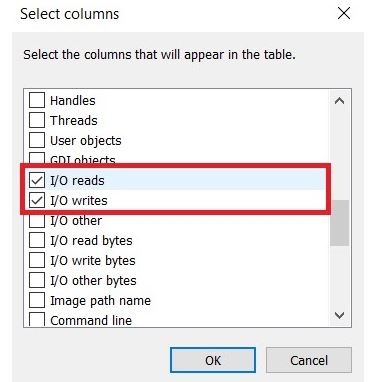 Bước 4: Một cửa sổ nhỏ hiện lên, bạn kéo xuống tìm và chọn vào 2 ô I/O writes (ghi) và I/O Reads (đọc) rồi chọn OK.