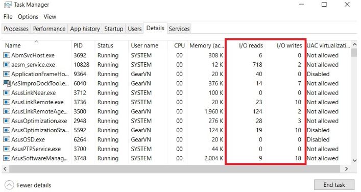 ✓ Bây giờ, mỗi khi bạn mở Task Manager lên và vào mục Details, bạn sẽ thấy xuất hiện thêm 2 cột là I/O Reads và I/O writes cho biết mức độ đọc ghi của từng ứng dụng.