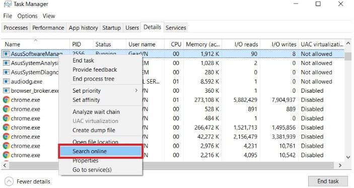 ✓ Nếu như bạn phát hiện một ứng dụng không rõ đang đọc ghi liên tục vào ổ cứng thì bạn điều tra nó bằng cách nhấp chuột phải và chọn Search online hoặc tra tên của ứng dụng đó trên Google.