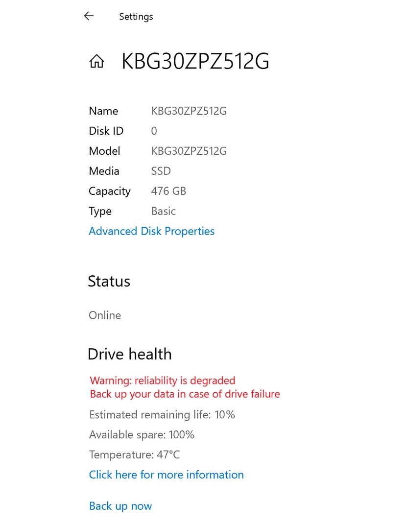 Nếu có vấn đề gì xảy ra với ổ NVMe, bạn sẽ nhận được một thông báo. Khi nhấp vào thông báo này hoặc truy cập vào mục Settings > System > Storage > Manage disks and volumes > Properties - nơi chứa thông tin tình trạng ổ lưu trữ. Ở đó, bạn sẽ thấy tuổi thọ ước tính còn lại, nhiệt độ hiện tại của SSD và cảnh báo bằng văn bản màu đỏ.
