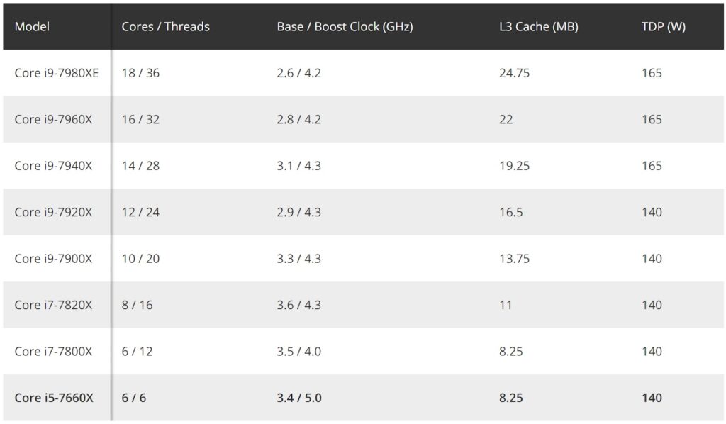 Theo những hình ảnh rò rỉ này, Core i5-7660X có xung nhịp cơ bản 3,4GHz, xung nhịp boost 5GHz (cao nhất trong gia đình Skylake-X), bộ nhớ đệm L3 8,25MB, TDP 140W. Nhìn chung thì Core i5-7660X là Core i5-7800X với xung nhịp cao hơn và không có Hyper-Threading. Core i5-7660X có 28 lane PCIe 3.0 và hỗ trợ RAM DDR4-2400 y như Core i7-7800X.